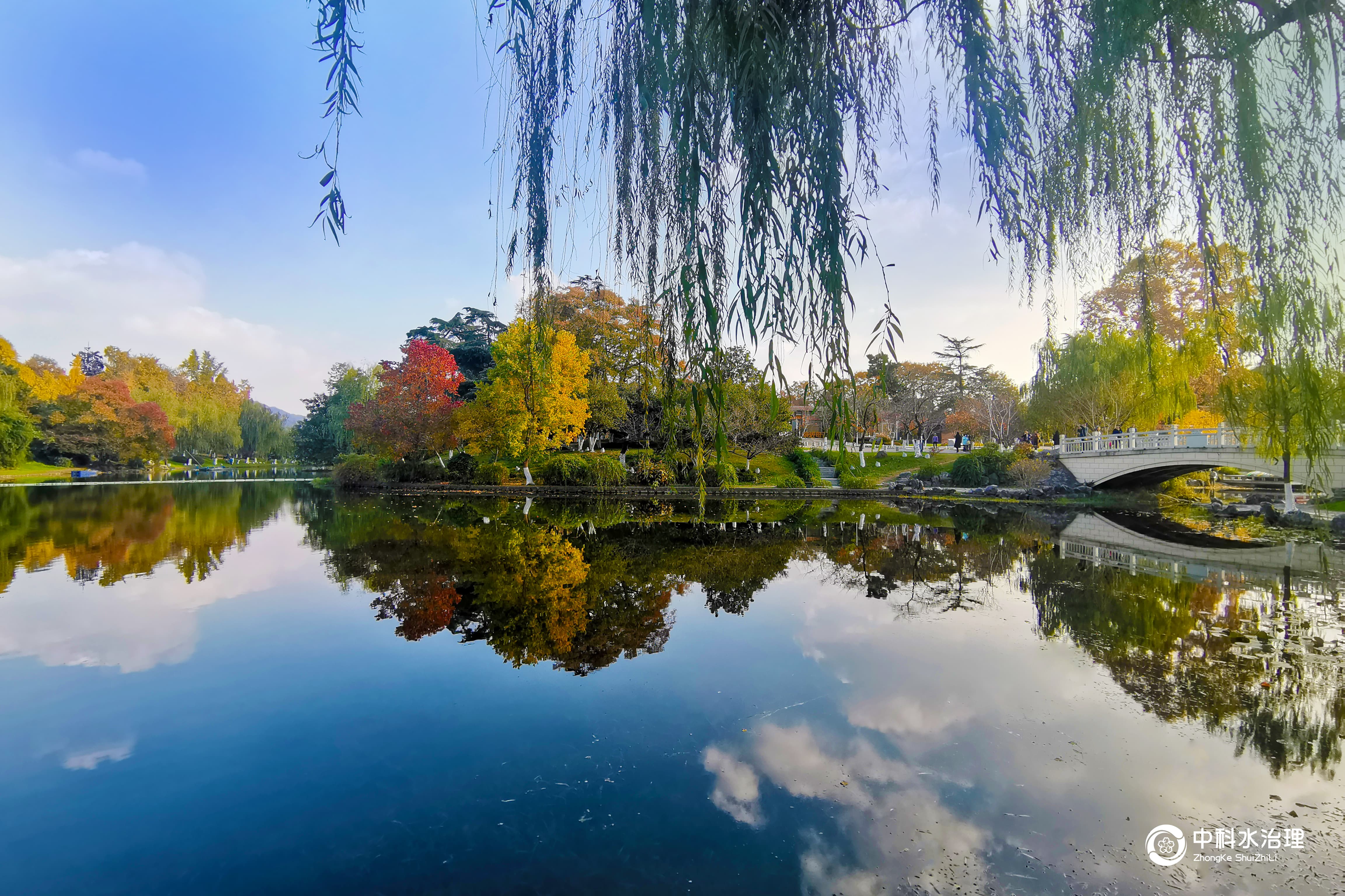 湖面水光瀲滟,湖堤上植被色彩斑斕