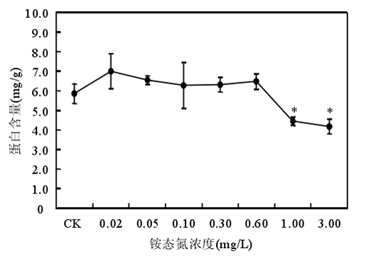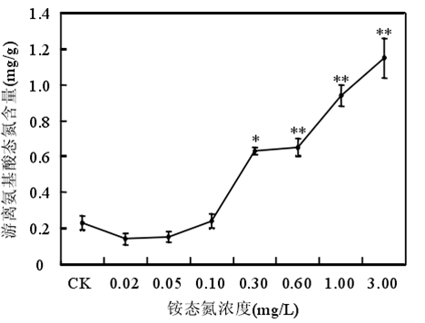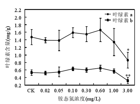 銨態(tài)氮濃度低于 0.60mg/時苦草生長良好,濃度大于或等于 1.00mg/L 時苦草的光合能力受到抑制、代謝受到干擾。苦草對銨態(tài)氮最敏感的生理生化指標是葉片中游離氨基酸態(tài)氮含量。銨態(tài)氮作為沉水植物的一種營養(yǎng)物質,當其含量較低時,植物由于營養(yǎng)缺乏誘導產(chǎn)生自由基。